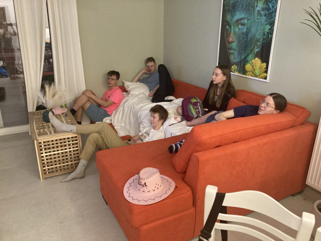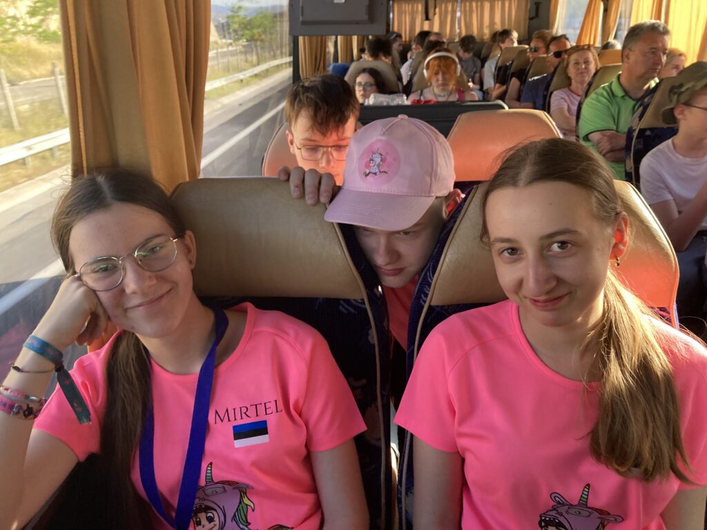 Hoolimata sellest, et buss sõitis 2h rohkem, kui see alguses pidi, jõudsime me ka lõpuks kohale. 19.20 saime bussist välja. Õhtusöök juba käis ja meie kõhud olid kohutavalt tühjad. Tegime ruttu “check-in” ära ehk näitsaime, et oleme kohal ja saime toad ja võtmed kätte. Tiimi peale saime 2 tuba ehk Mirtel, Greete ja Mai olid ühes toas ning Karl, Romet ja Oliver teises toas. Õigemini ning siis jooksime jalad seljas sööma. Nälga me ei jäänud – pakuti kartulit, kanaliha, salatit ja oi oi oi kui magusaid ja värskeid apelsine!